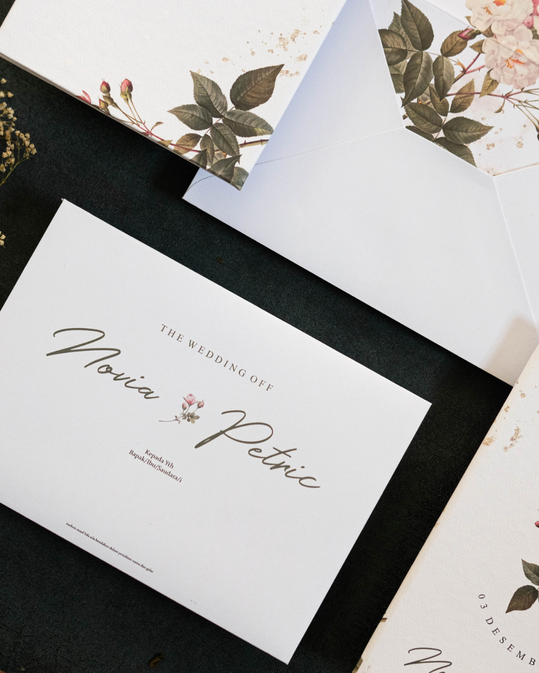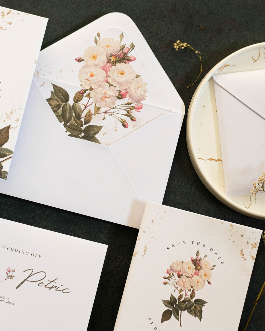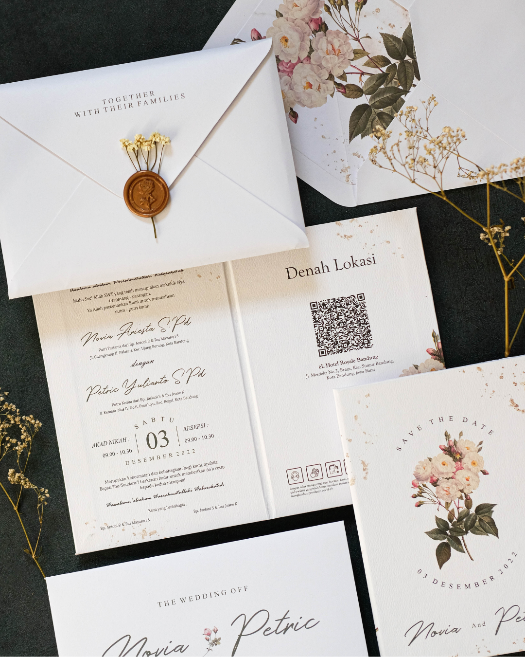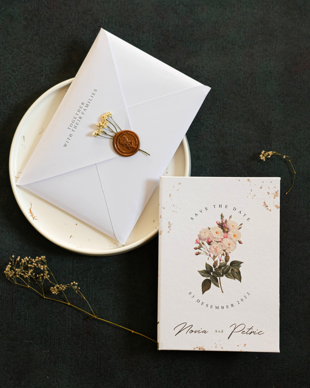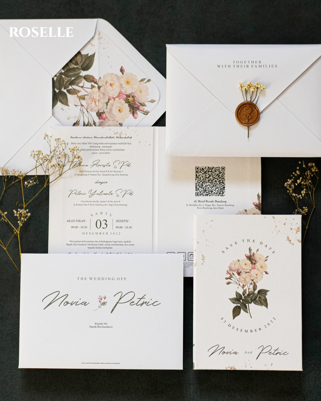 Roselle features a softcover rounded rectangle format paired with a coordinating pocket envelope for a clean and organised presentation. The arch insert introduces subtle shape variation, while the combination of florals and a gold wax seal adds warmth and visual depth.